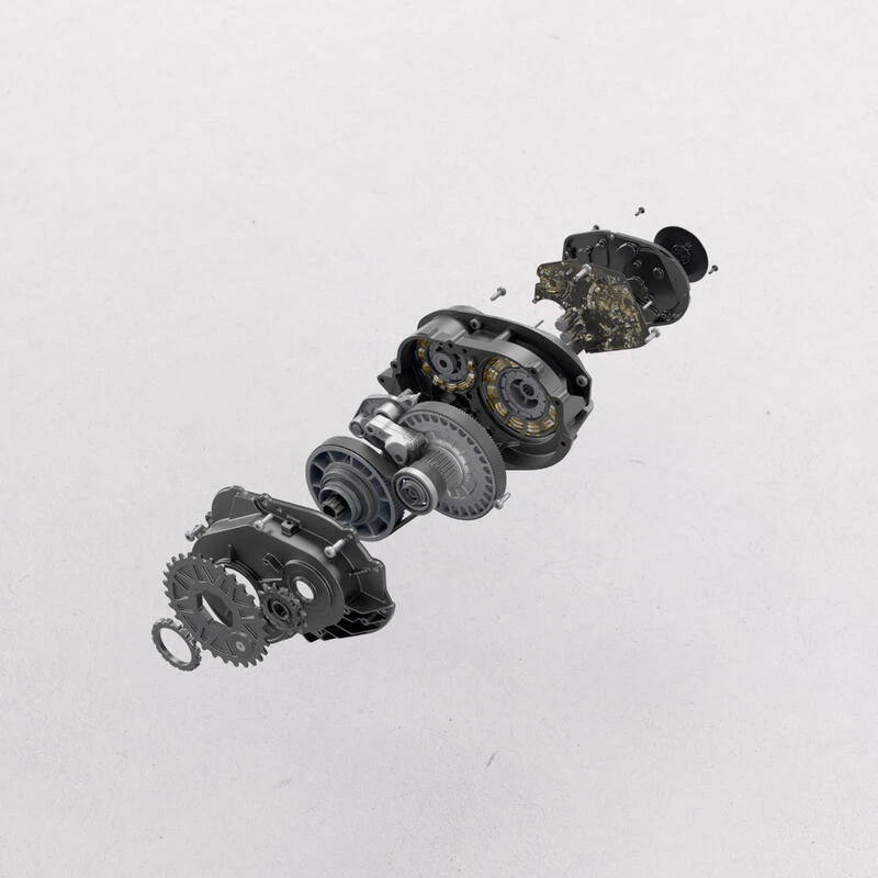 Moteur central équipé d’un CVT (Continuous Variation Transmission) que l’on retrouve sur certaines voitures hybrides.