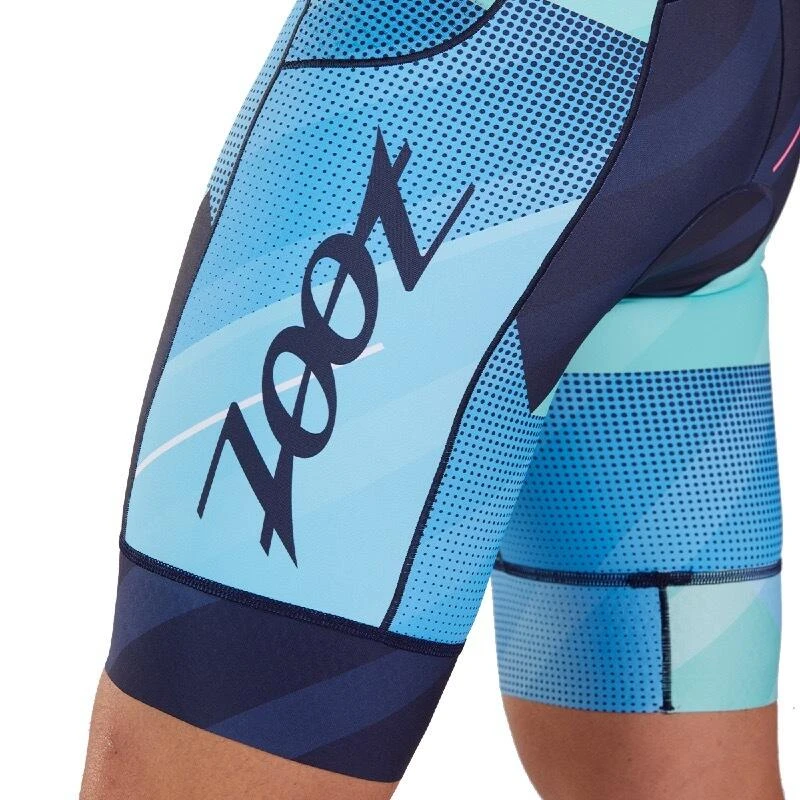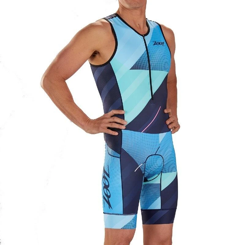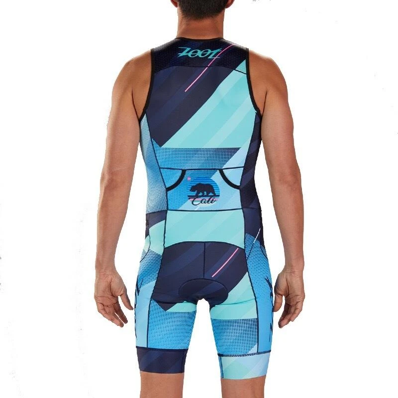 Combinaison de triathlon Design Cali Tri Hommes Bleu clair/bleu foncé sans manches, éléments réfléchissants, SPF 50+, deux poches arrière et zip frontal de 15cm Zoot